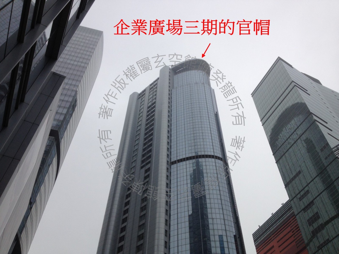大廈西面見企業廣場三期的形巒,形狀似古時官帽,湊巧理氣星盤為六、一飛星組合 ,主升職掌權之象。大廈西南方位叠見三叉水口與四水歸田,飛星組合為一、六,主貴人多遇,名揚天下之兆。回顧朱雀方,近方外巒見方形貨倉,在理氣盤上形成形煞,對吸納旺氣有所影響。