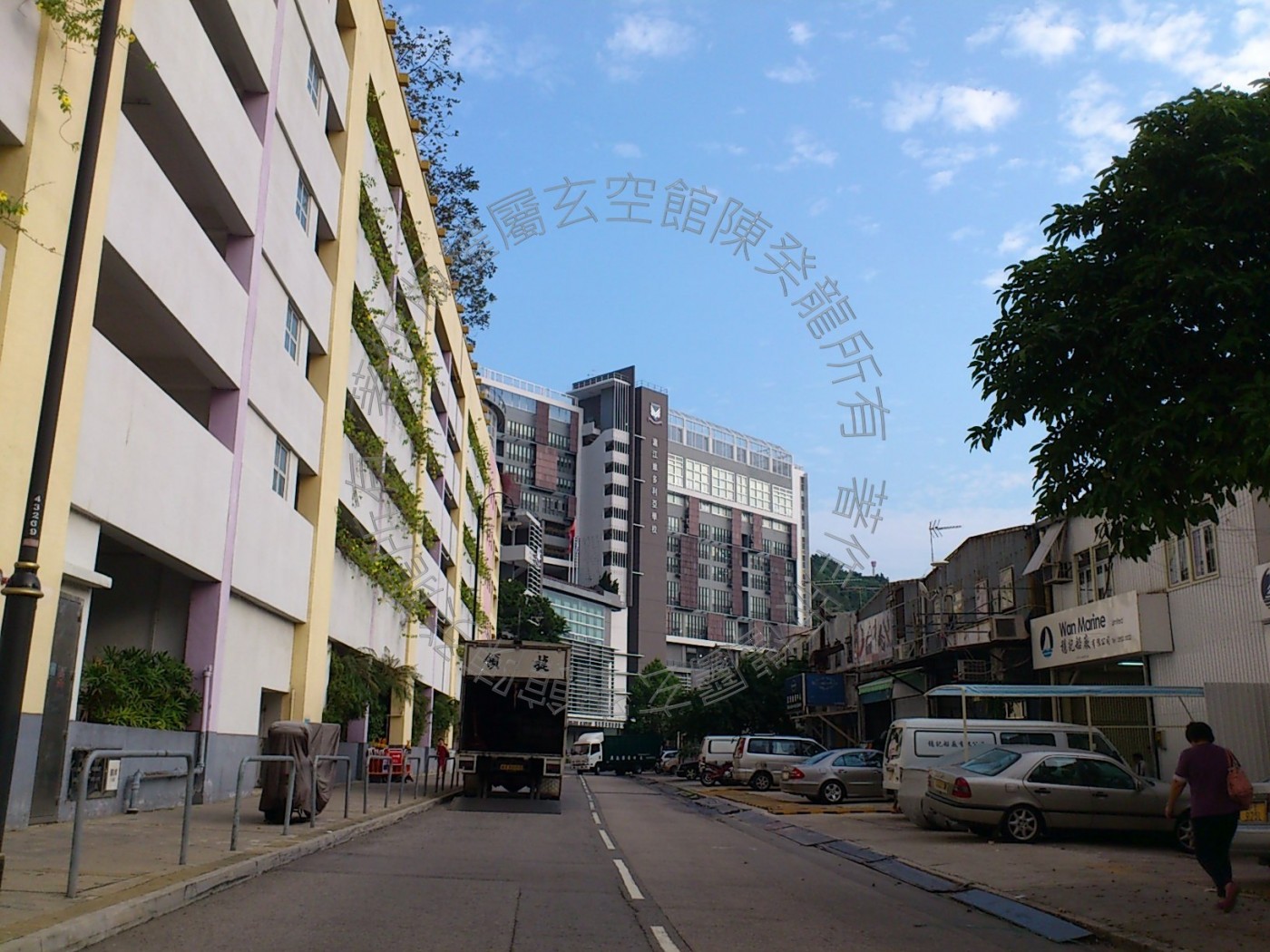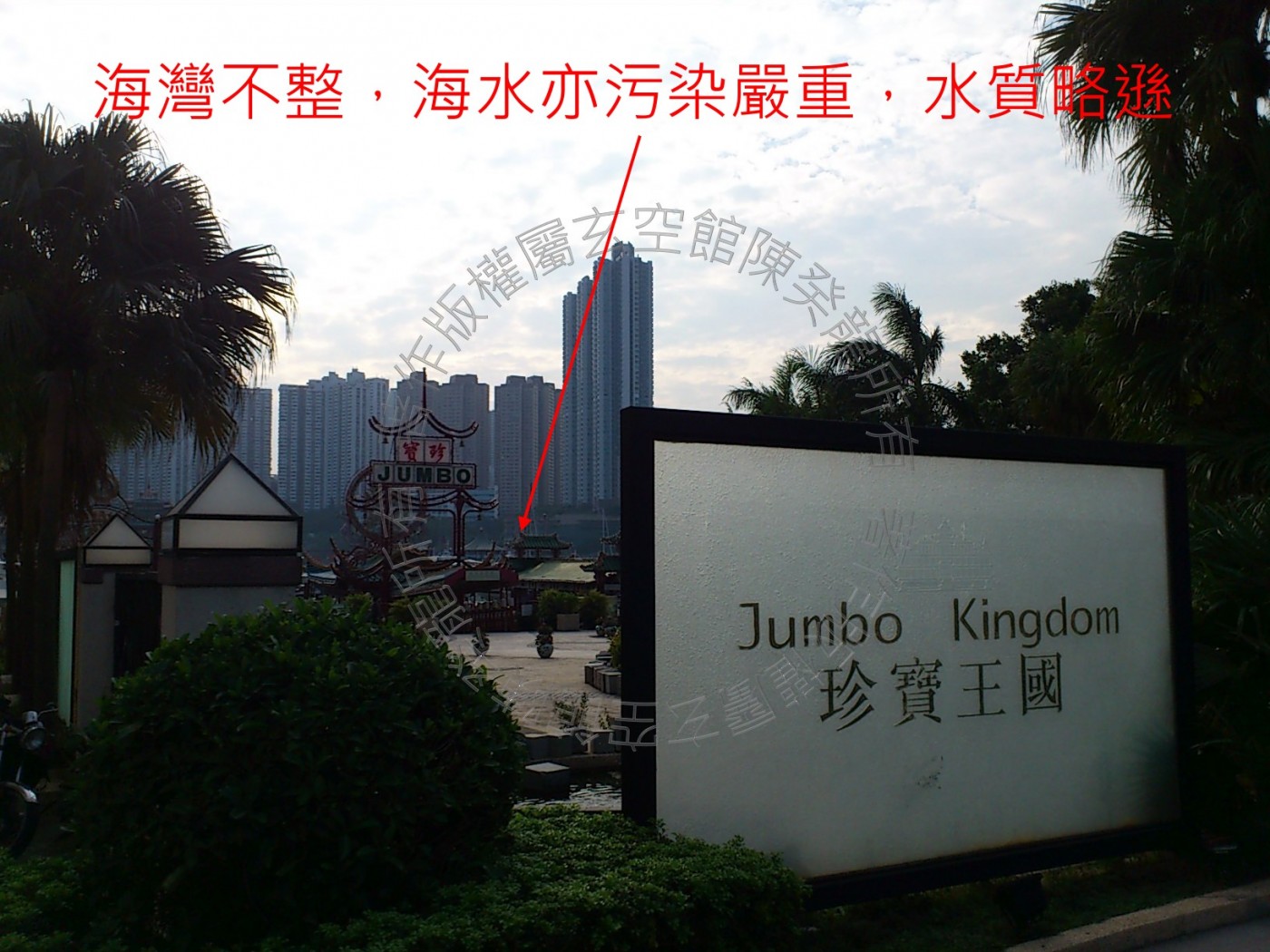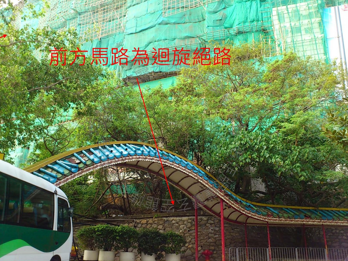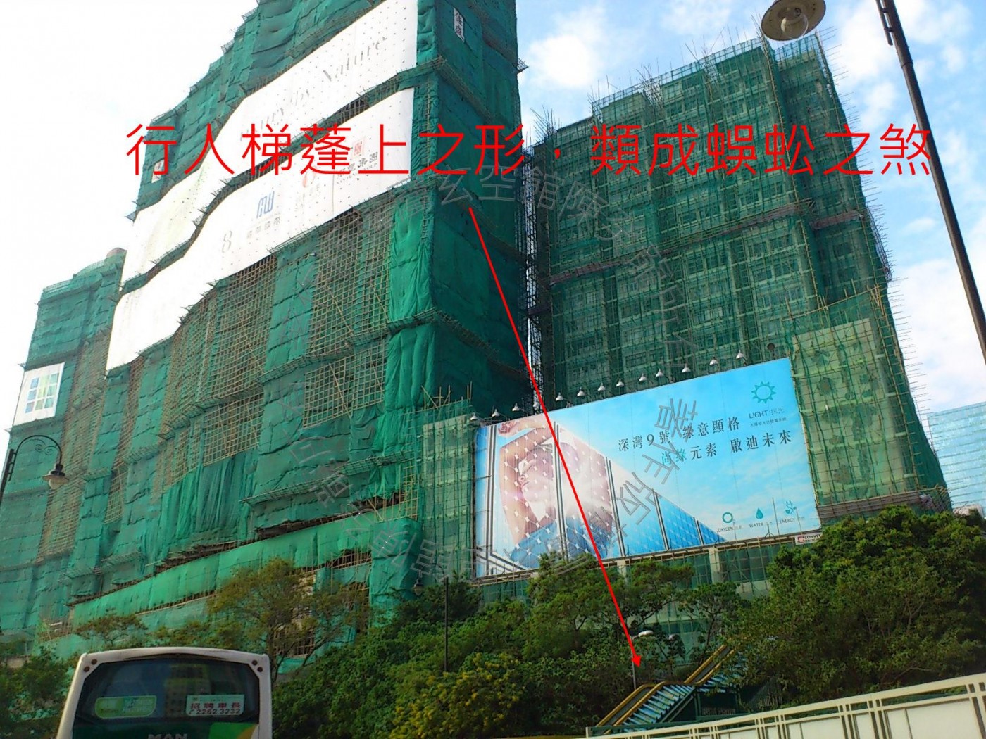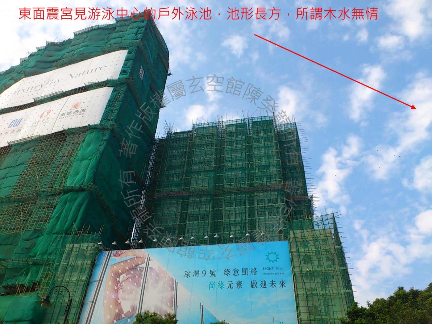 前方馬路為迴旋絕路,停泊著車輛,路氣不順,又被行人梯蓬上之形,類成蜈蚣之煞來環作抱,不美。東面震宮見包玉剛游泳中心的戶外泳池,池形長方,所謂木水無情,此方又逢巴士總站成氣煞之患,未來入宅之男士在工作上,將勞而不獲,此宮又見建築地盤,地氣受損,尤要留意身體健康。