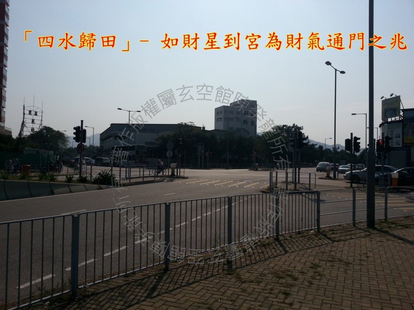 屋苑東面震方見十八鄉路與大旗嶺路「三叉水口」,車況往來生氣凝聚,如此方位置是屋苑理氣城門,理氣城門挨排到此方,必會比旺屋苑旺氣財運,以補向首不見水之失。