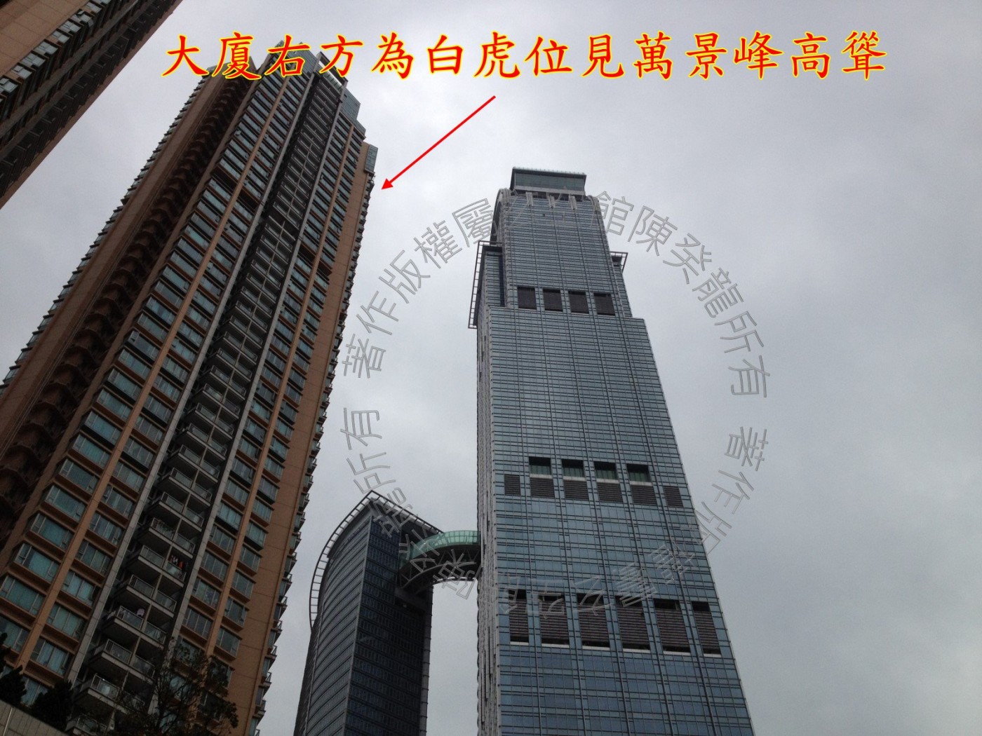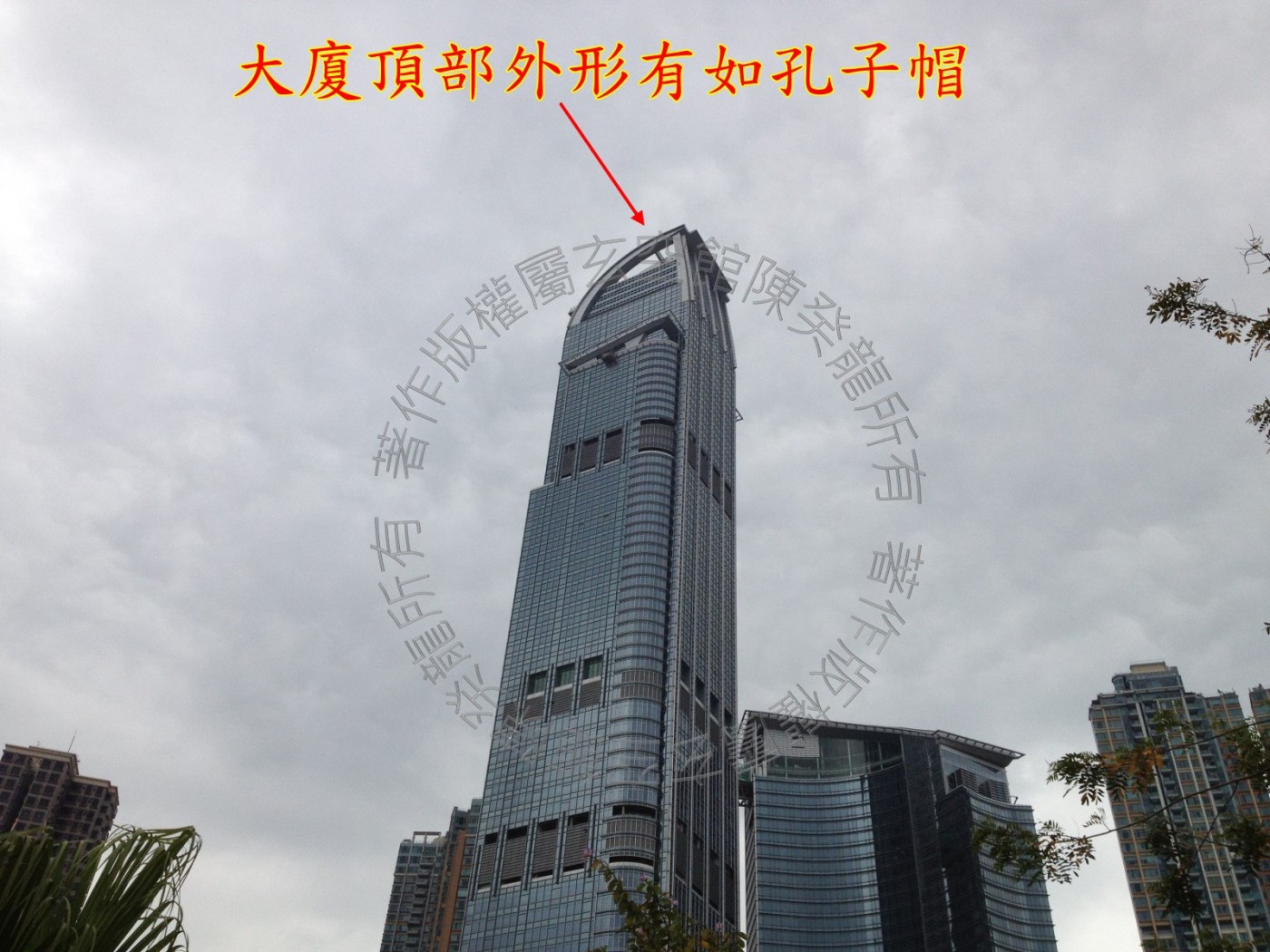 大廈頂部外形獨特有如孔子帽,亦能催旺週邊大廈的文昌之氣。大廈右方為白虎位見萬景峰高聳,而左方青龍位則失靠,顯示宅內多為女性掌權之象。