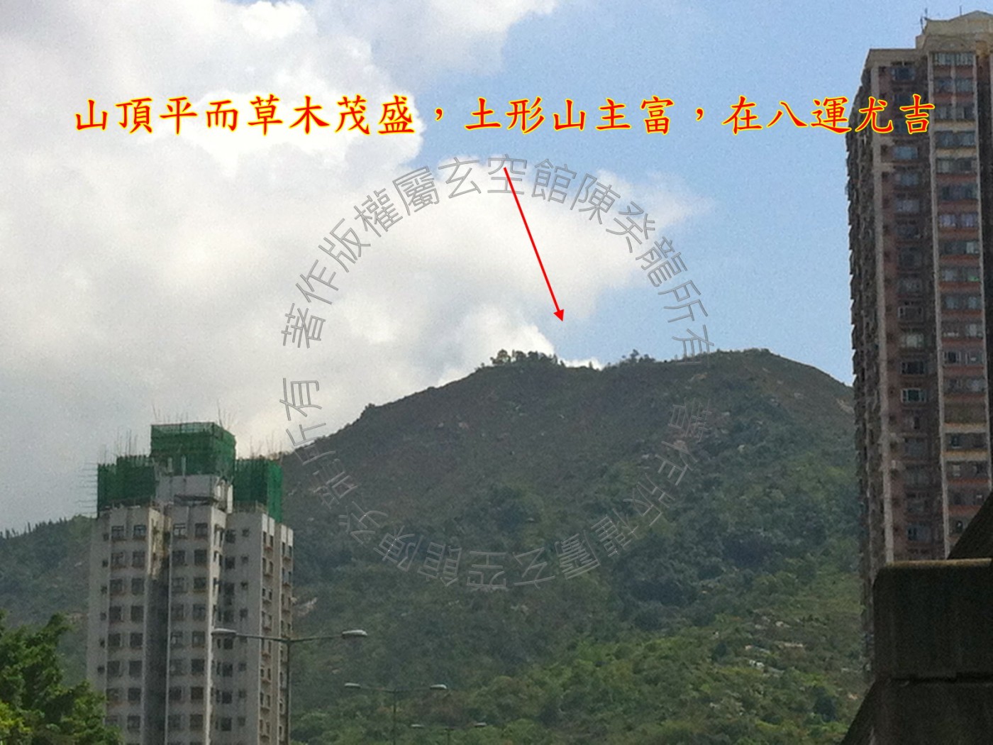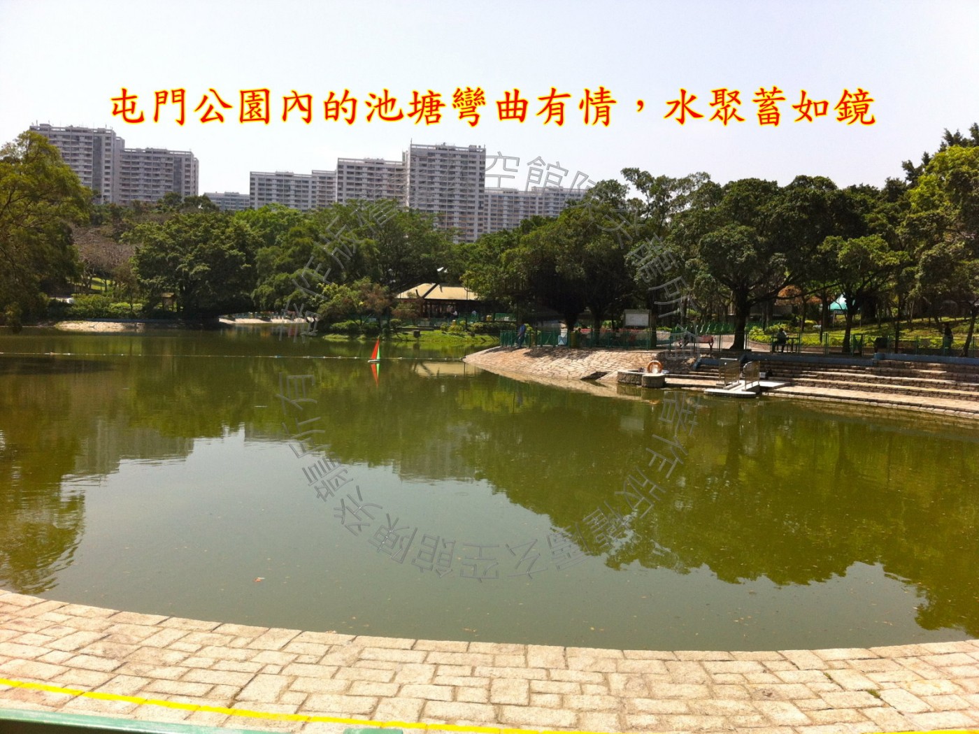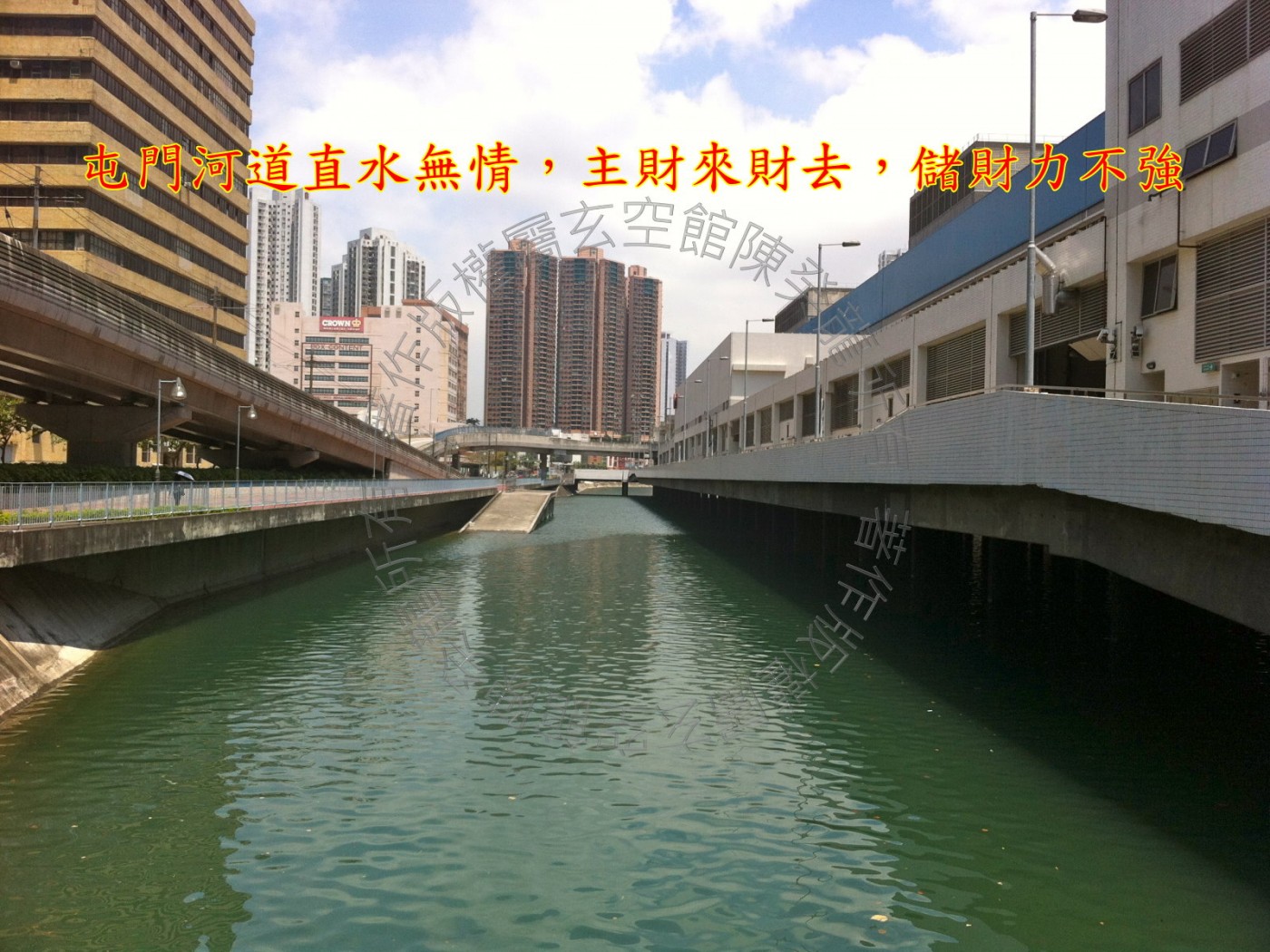東南巽方車路交滙成四水歸田、南離方之屯門公園內的池塘彎曲有情,水聚蓄如鏡、屋苑內的戶外泳池生氣蓬勃,此等皆可成聚財之局,假若大廈立線得吉,理氣星盤八運令星到臨此三方之任何一方,財運佳。相比下,屯門河道河水污濁,水從北坎方來至西南坤方消去,此直水無情,如八運令星到臨此方,主賺錢過程則較艱辛,財來財去,儲財力不強。