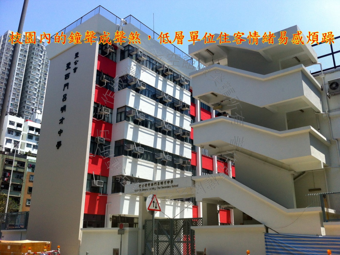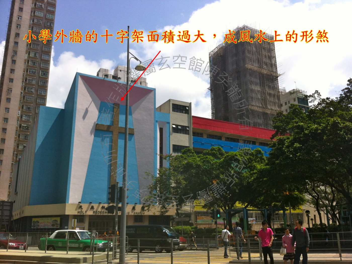 東震方及北坎方為學校,校園內的鐘聲成聲煞,低層單位住客情緒易感煩躁;青山天主教小學外牆上的十字架面積過大,成風水上的形煞,如窗外景觀正望此巨型十字架,不為美。西兌方遠見警署及消防局,消房局五行屬火,如星盤上此方位火氣過猶,則宜特別留意宅中人脾氣過燥之事;近處第二座及第三座之間見輕鐵沖射,風水上亦計教多矣。