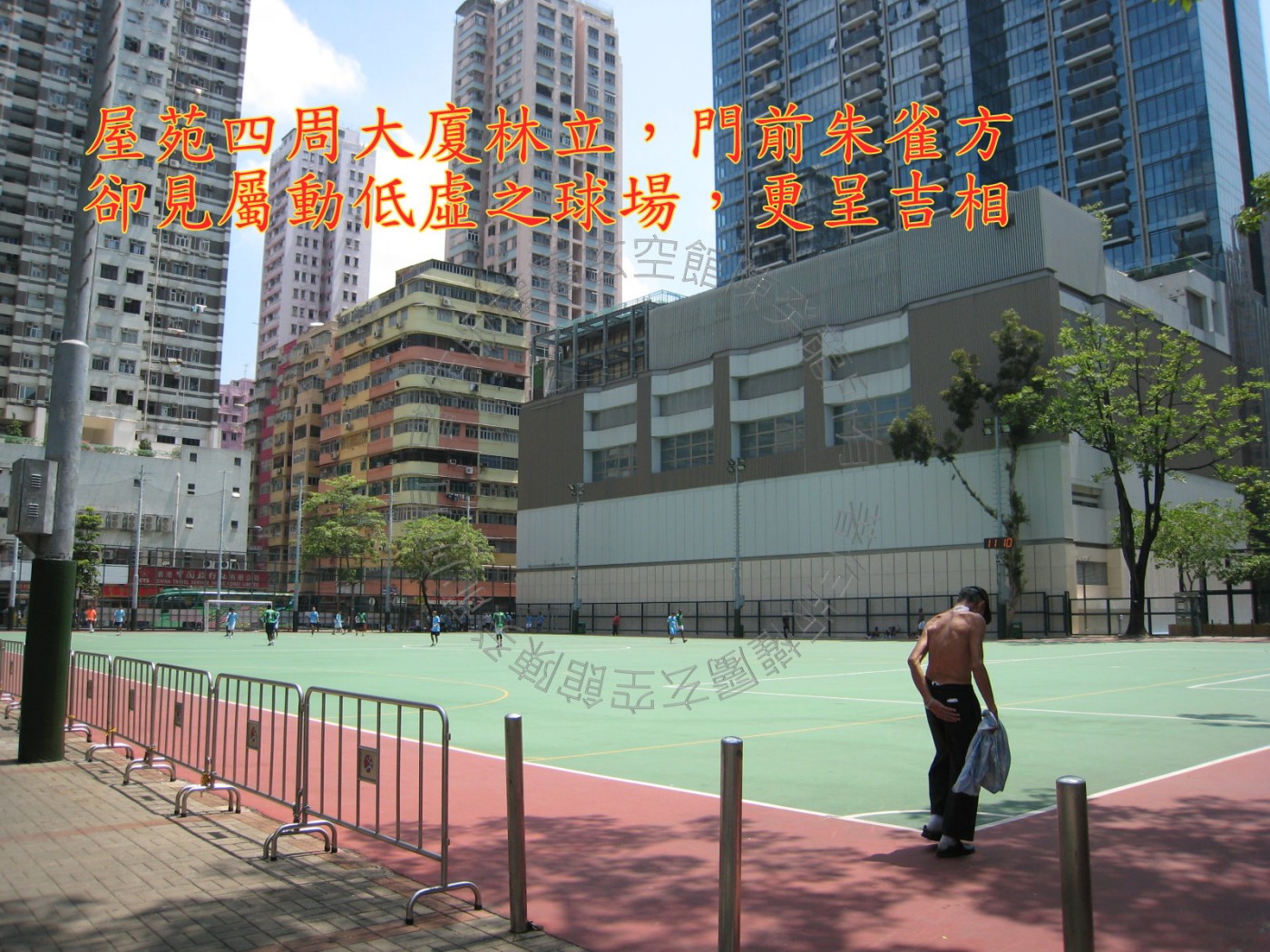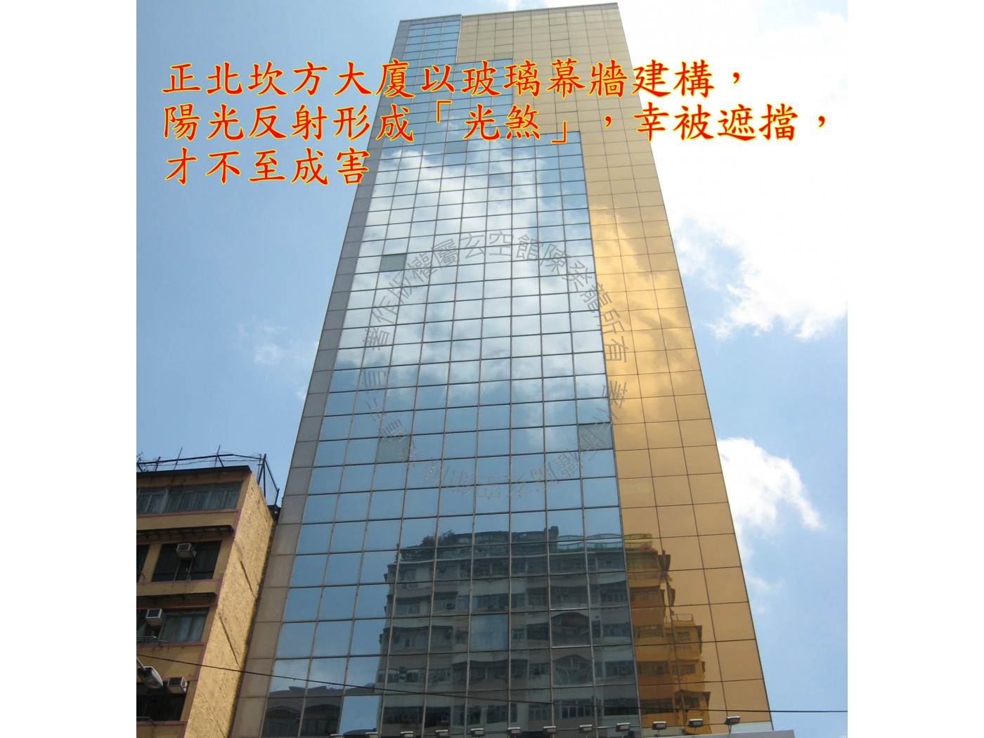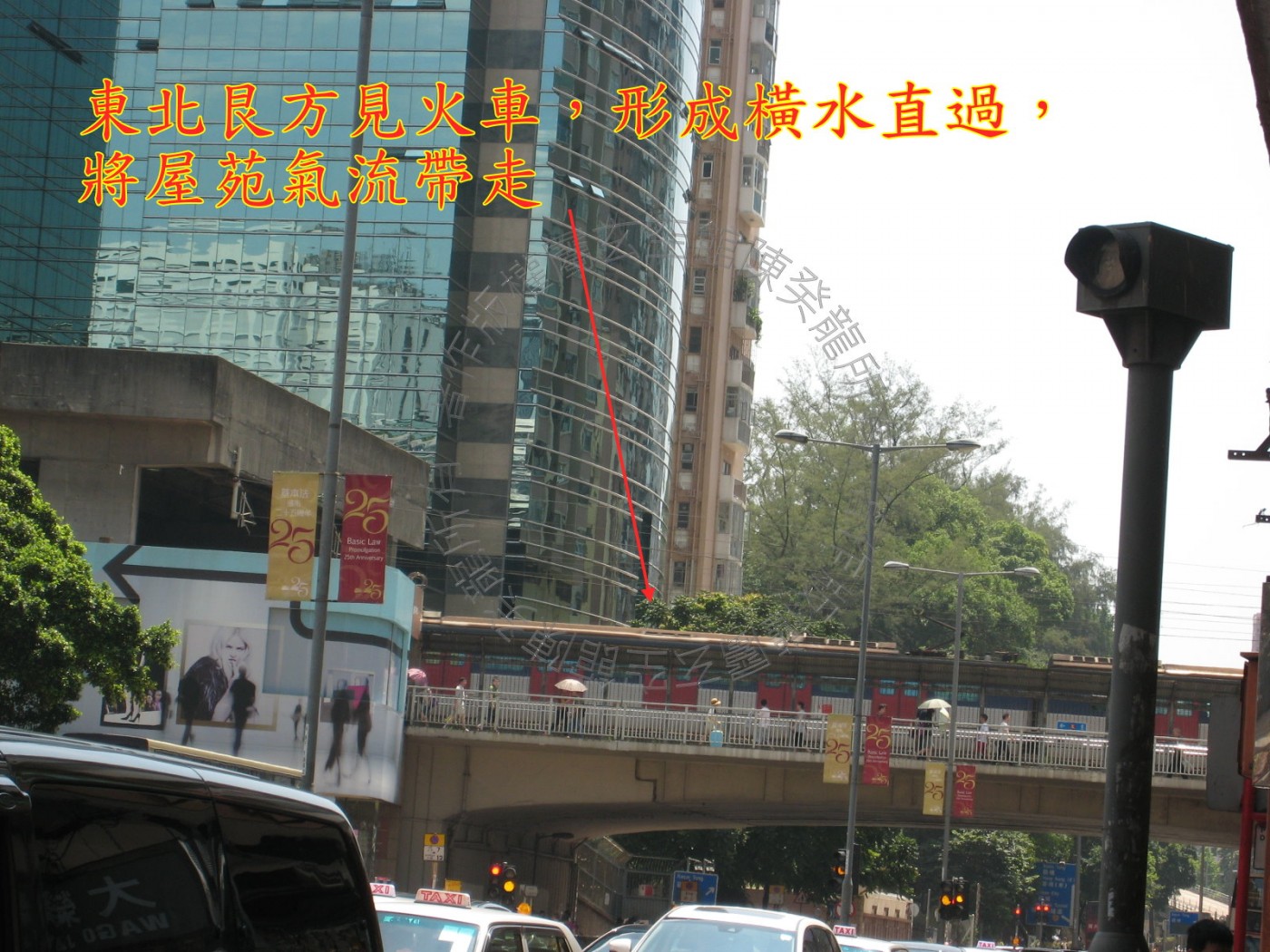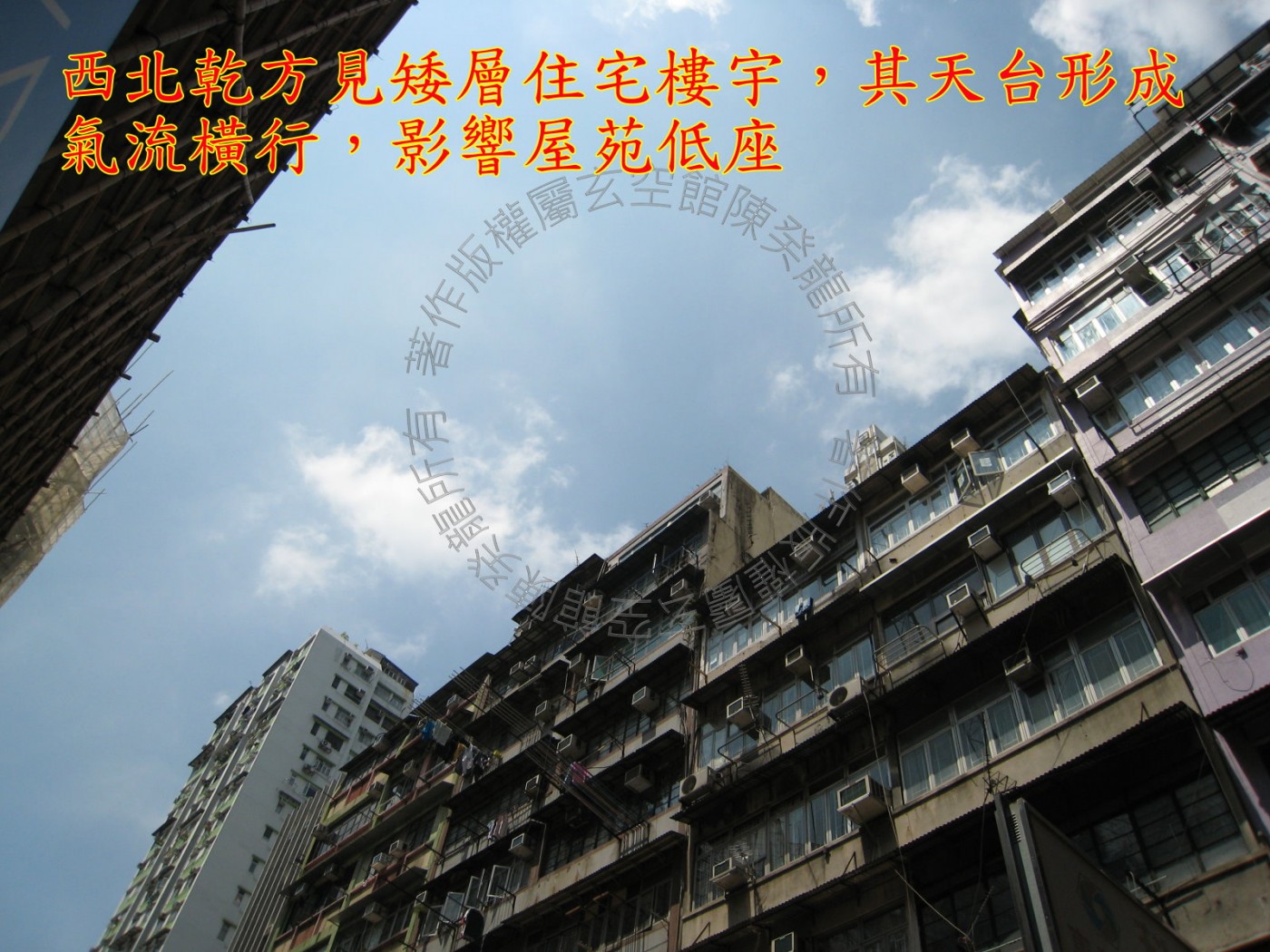 西北乾方見一排舊式樓宇,只有幾層高,其天台導致氣流橫行,氣場不穩而吹向大樓,住在低層而正正面向着這排天台的單位尤須注意,恐有損人丁健康。