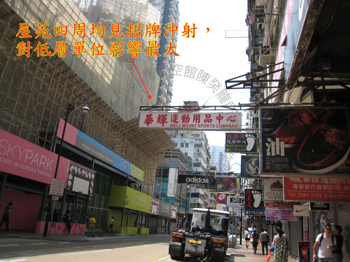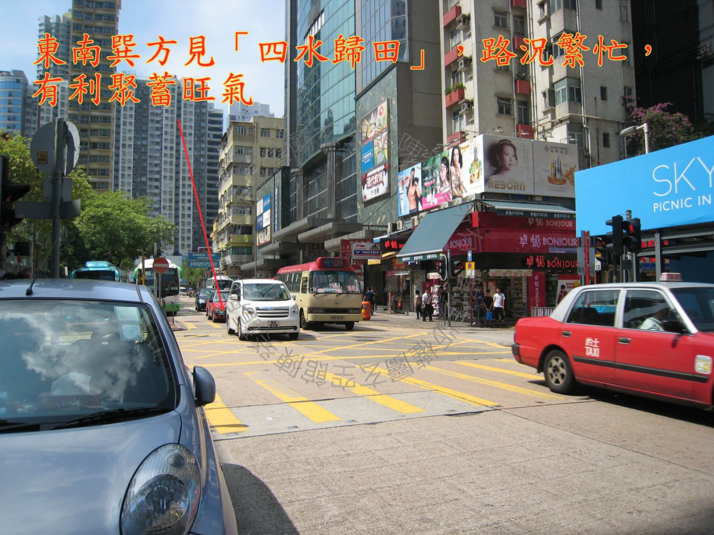 西南坤方正是「波鞋街」所在,不論日夜,人流極旺,這本能帶動旺氣到宮,惟要注意的是人多自然嘈雜,而且有大型廣告牌,晚上射燈通明,形成「光煞」,強光直射入宅,對人的情緒及身體健康不利,以低層單位影響最爲顯著。