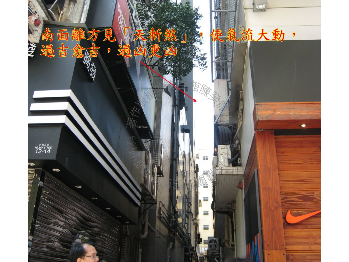正南離方面向一排樓宇,樓宇之間的窄巷形成一道「天斬煞」,風從窄縫中穿過後,便會以正常較快的速度吹向大樓,這導致氣流大動。天斬煞可說是亦吉亦凶,因旺星喜動,若然吹動此方的宮位挨排旺星,則旺氣大增;但若然是二、五等病星、災星,則爲禍甚烈,不得不加以留神。