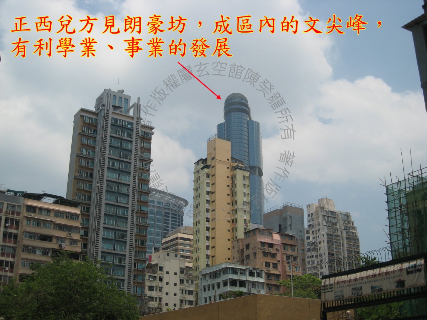 正西兌方見朗豪坊。旺角區一般以舊樓爲主,樓層不高,朗豪坊相對而言樓層最高,極爲突出,因此成爲區內地標。朗豪坊除爲區內樓宇的靠山外,亦是區內的「文尖峰」,見之則有利事業功名的發展;若大樓此宮位收得一四或六一之山向星組合,本已主能出官貴文秀之士,文尖峰則更能彰顯其效。