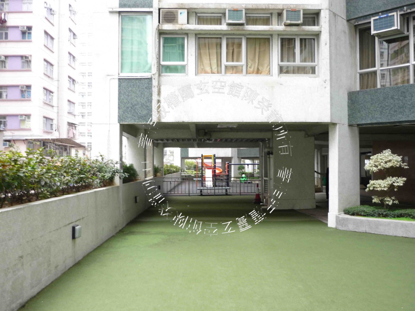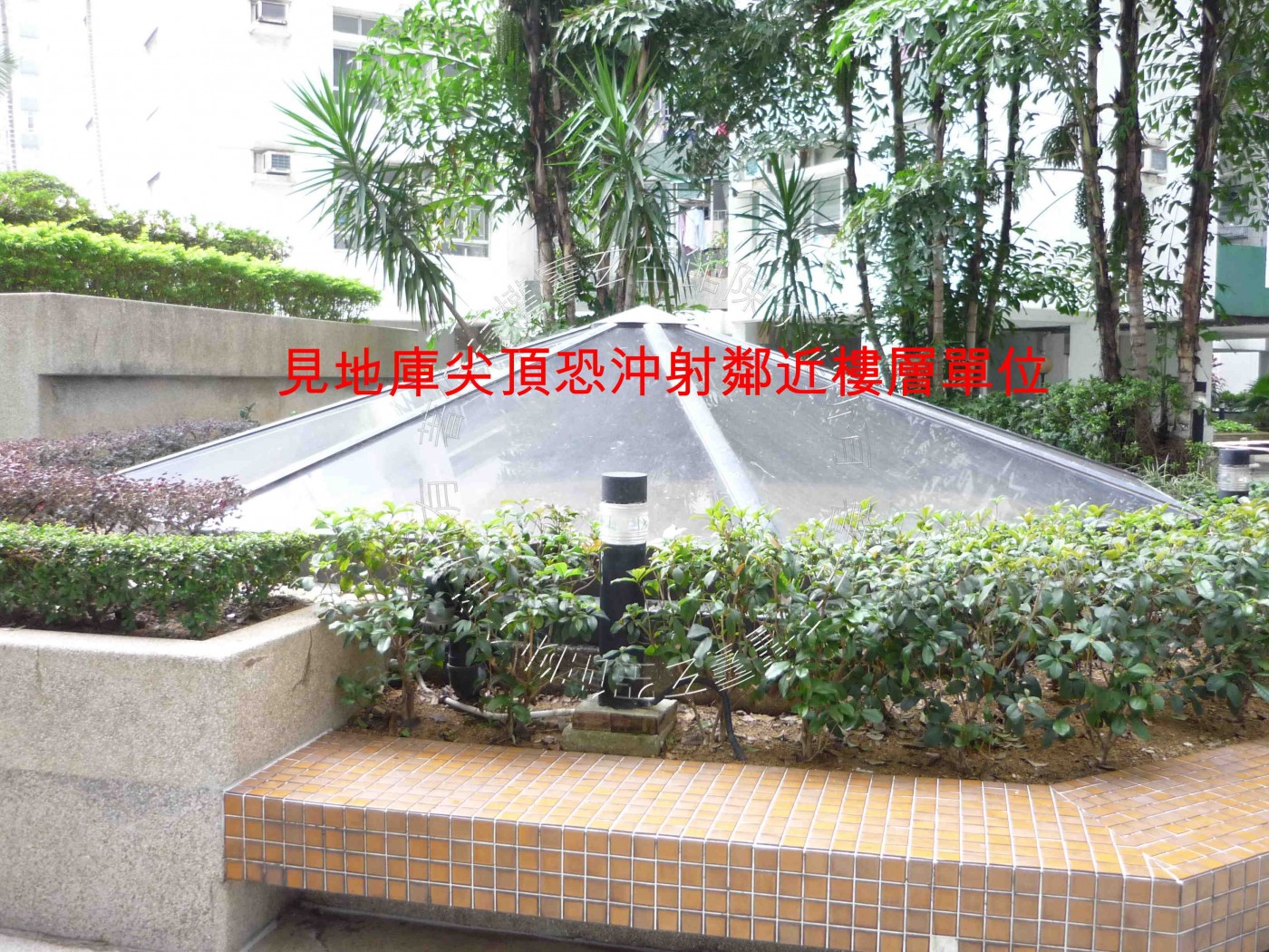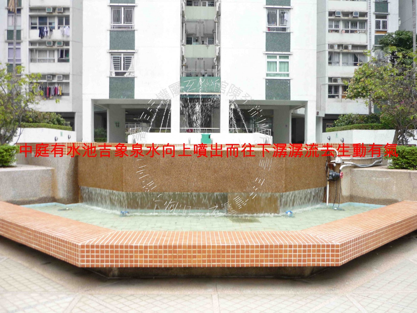 前庭朱雀見馬路虛水,來水自西面兌方而來,於北面離方緩緩消去。後方玄武有靠。中庭有水池吉象,泉水向上噴出,而往下潺潺流去,生動有氣。宅氣得局者可錦上添花,吉中加吉。惟水池旁邊見地庫尖頂,恐沖射鄰近樓層單位,宜於宅內朝向方栽種竹樹植物,以減其害。