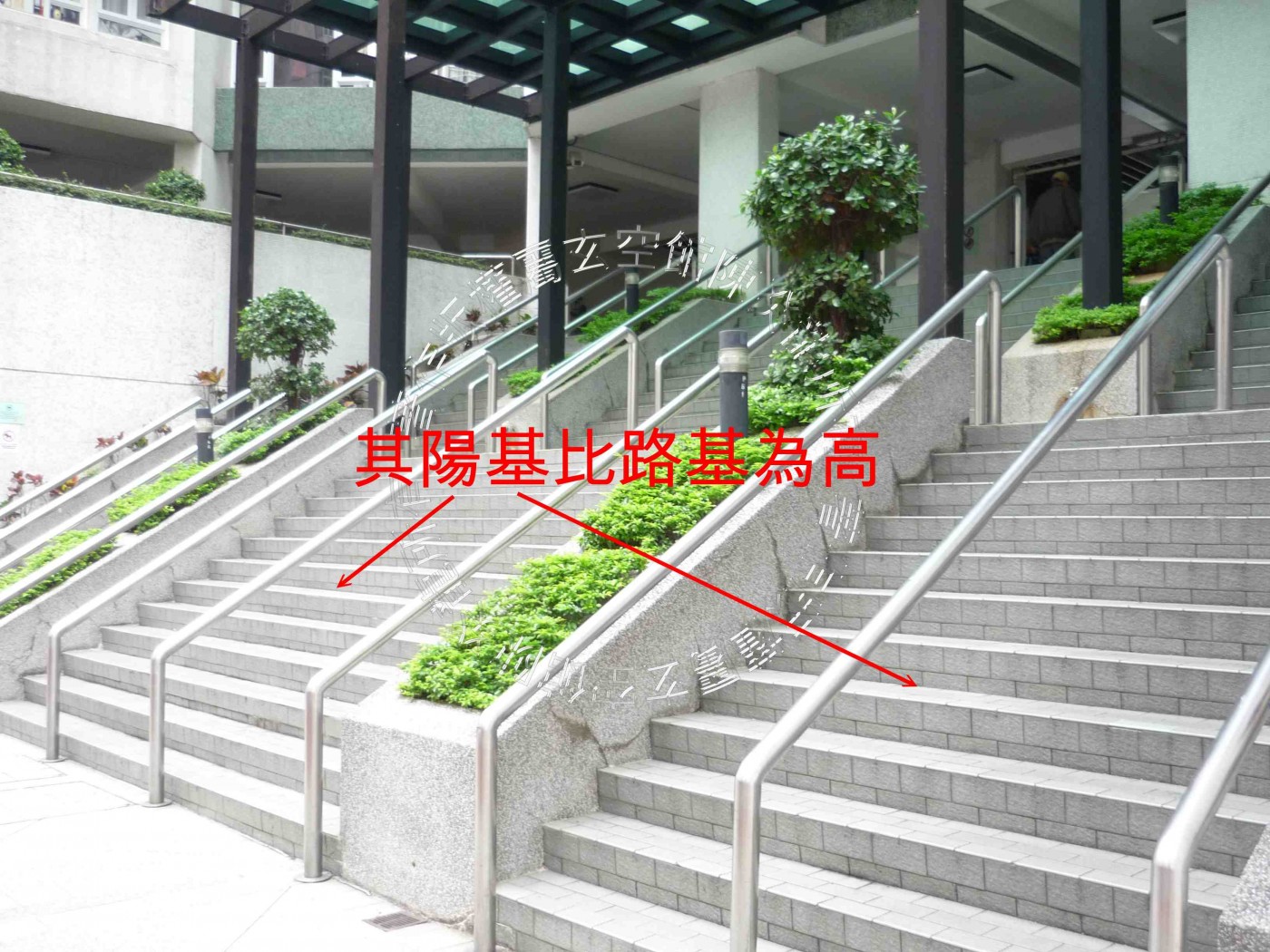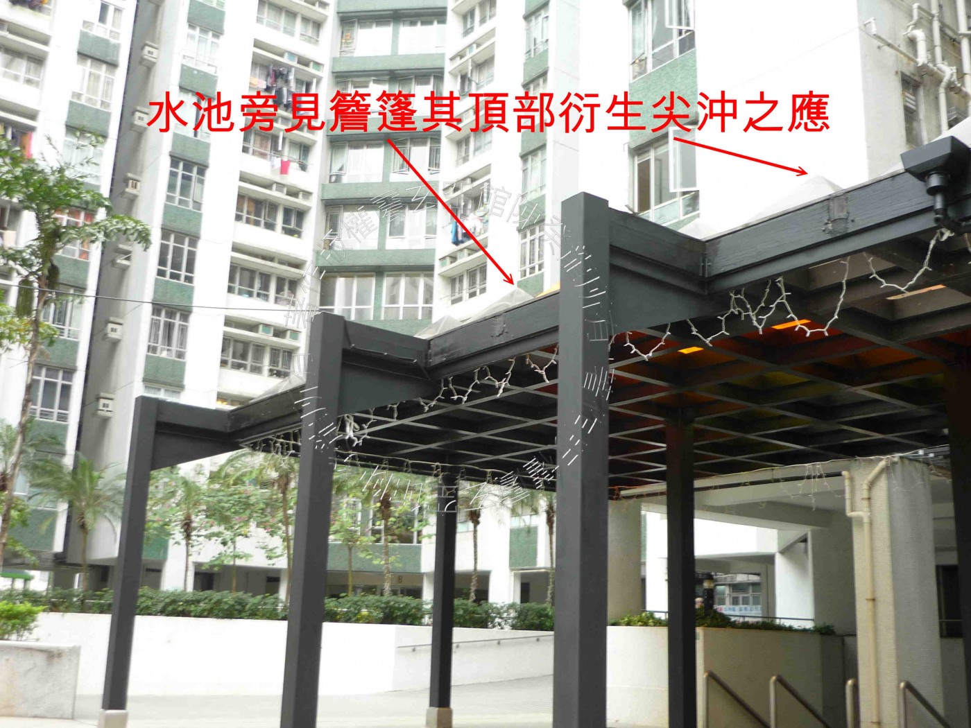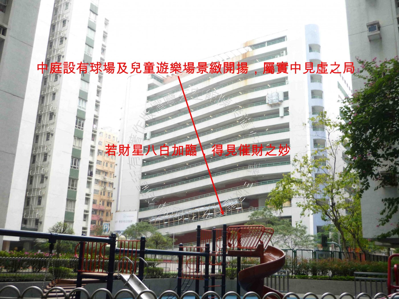 前庭朱雀見馬路虛水。來水自西北乾方而來,於東面震方消去。後方玄武為紅磡南路,交通頻繁,屬橫水湍急。倘見山星落於此方,恐會影響人丁健康。中庭分左右兩區。右方有假石水池,嫌形態不美,且乏生氣。水池旁見簷篷,其頂部衍生尖沖之應。鄰近樓層宜於宅內朝向方栽種植物,以減其害。左方中庭設有球場及兒童遊樂場,景緻開揚,屬實中見虛之局。若財星八白加臨,得見催財之妙。